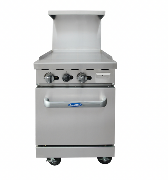 Whether used to cook bacon, eggs, pancakes, or hash browns, the Atosa AGR-24G 24" Gas Range with 24" Griddle and (1) 20" Oven provides powerful performance to get the job done. Featuring a heavy duty 3/4" thick polished steel griddle plate with 48,000 BTU, this unit produces consistently high-quality food. Easy to operate, this thermostatically controlled unit has independent manual controls for precise temperature adjustment.